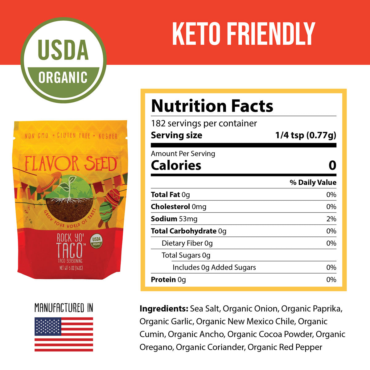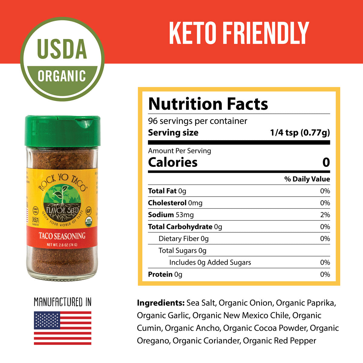 Rock Yo Taco organic taco seasoning is made of Sea Salt, Organic Onion, Organic Paprika, Organic Garlic, Organic New Mexico Chile, Organic Cumin, Organic Ancho, Organic Cocoa Powder, Organic Oregano, Organic Coriander, Organic Red Pepper